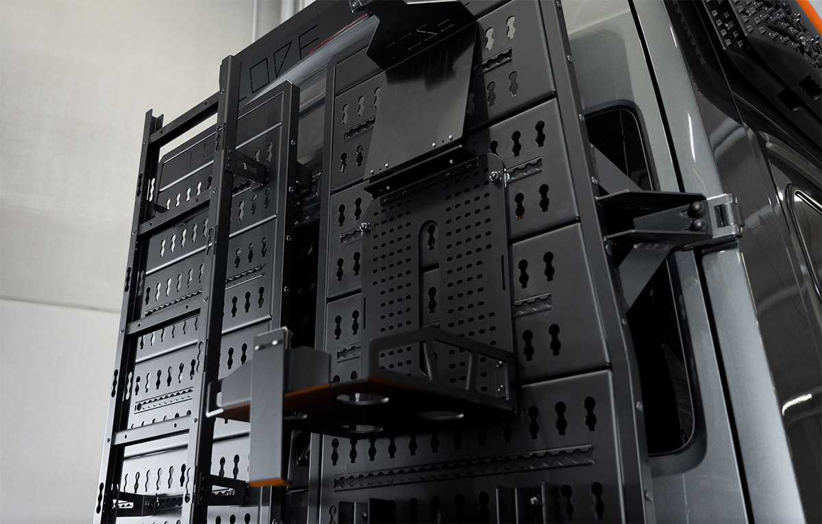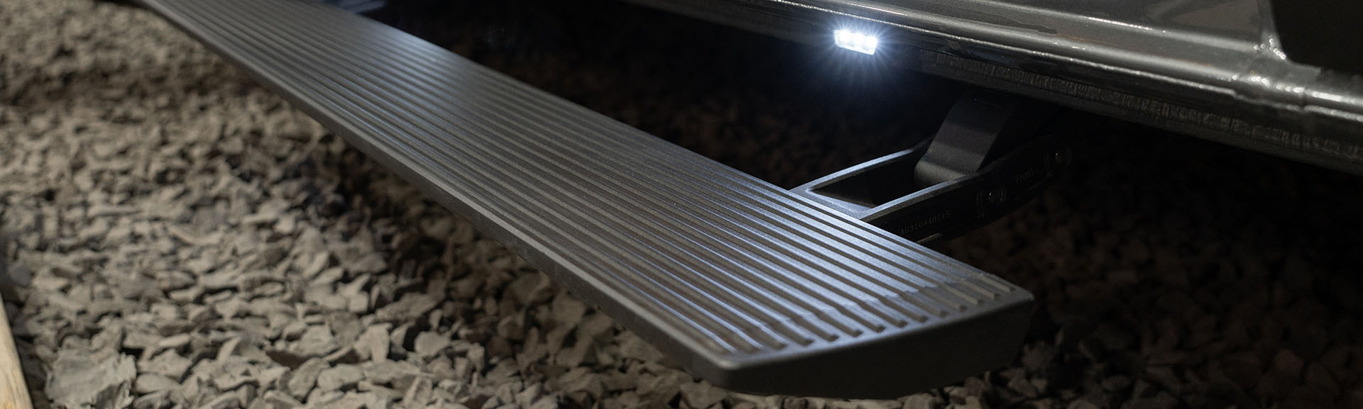 Die elektrische HD Schwenk-Trittstufe (1310 mm) fährt in unter 2 Sekunden leise aus und verschwindet im Gelände unsichtbar unter dem Fahrzeug. Extrem robust (bis 240 kg) und mit LED-Beleuchtung für sicheres Ein- und Aussteigen.
