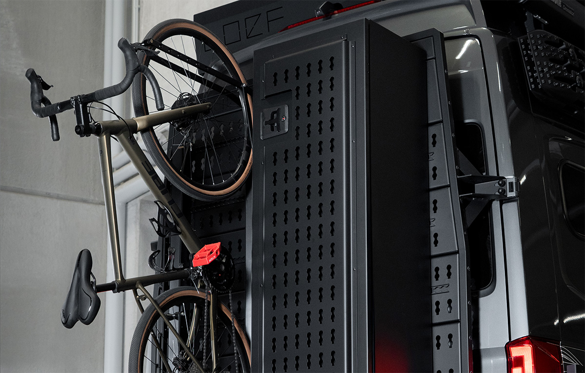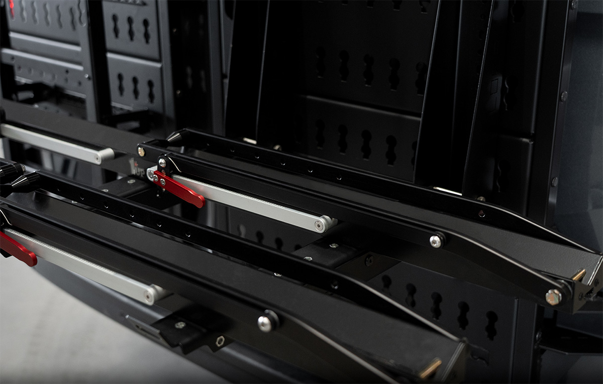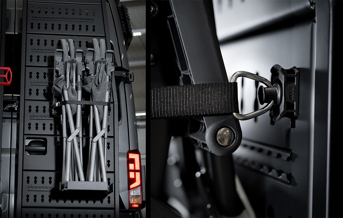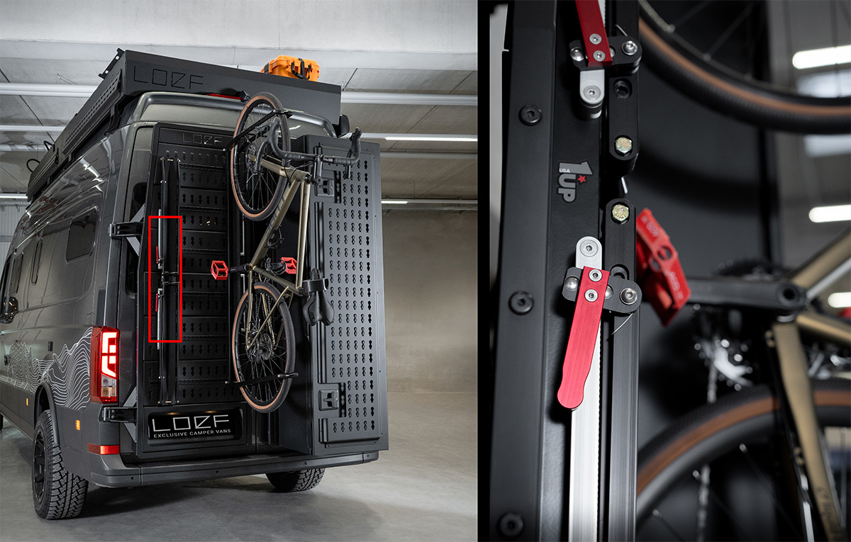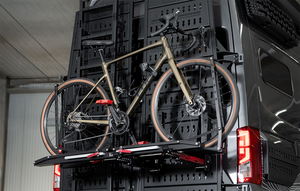 • Befestigung: Der Mount wird direkt auf der modularen Trägerplattform des Heckträgersystems montiert und hält die Keile während der Fahrt sicher in Position.